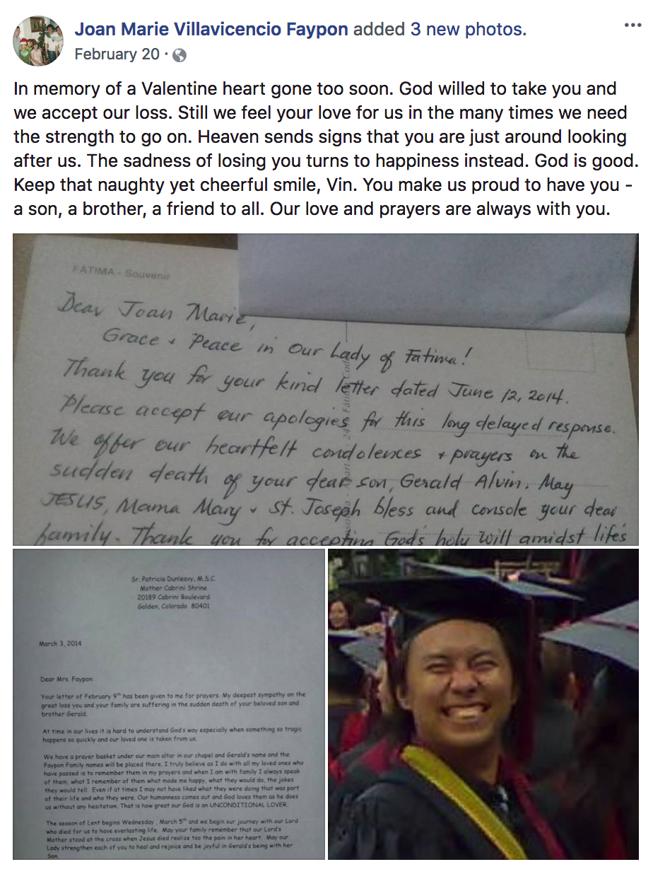 Joan Marie Villavicencio Faypon … You would have turned 36 today. A dear heart. My firstborn son. My Valentine baby boy. Still, even until now, you never fail to send us signs of your unseen presence . . . Of God’s love for us . . . Silent messages that bring smiles and warmth to the heart. The family misses you dearly. Sending our love, hugs and kisses. 💋💋💋❤❤❤🙏🙏🙏 Ever grateful for the love of God.