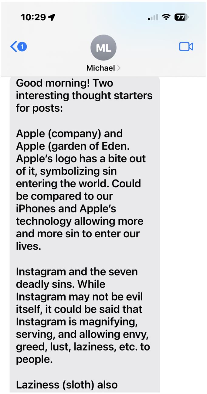 Michael’s text message continues in this next screenshot from my mobile phone, to which I reply about the coincidence of my phone battery.