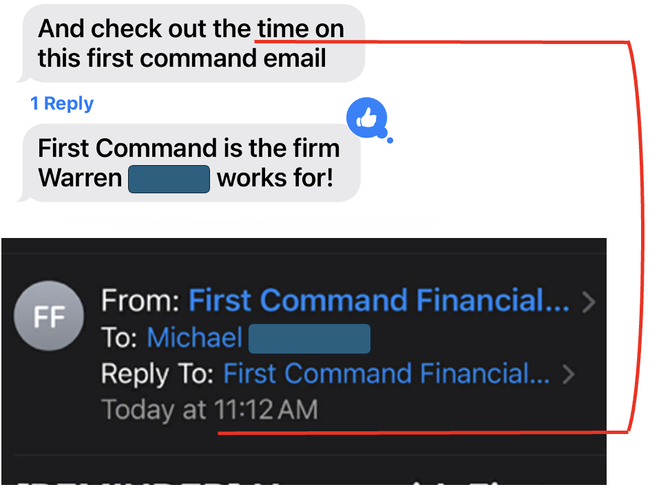 In the next image, he points out the “time” an email arrived from a financial manager. Reasons for the time being relevant include the fact that finances are of great concern for us currently and this email comes from one of the financial managers we are considering working with. Of all the times in a day that an email could arrive, the fact that it arrived at a time that has the same numbers as the ones in my birthday is a sign that God recommends this manager, too. Especially, when the pattern of “precise coincidental timing for relevant situations in life” has already been established between God and me.