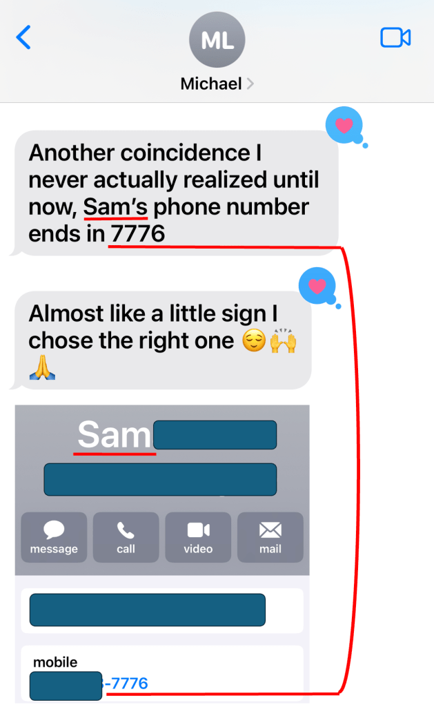 In this first image, my son is telling me he realized that the last 4 numbers of his wife’s phone number are “7776” and he feels like this is a sign that God is blessing his marriage with Samantha. I wholeheartedly agree and am so glad to see this in the image below. The red lines are to help you identify this evidence.